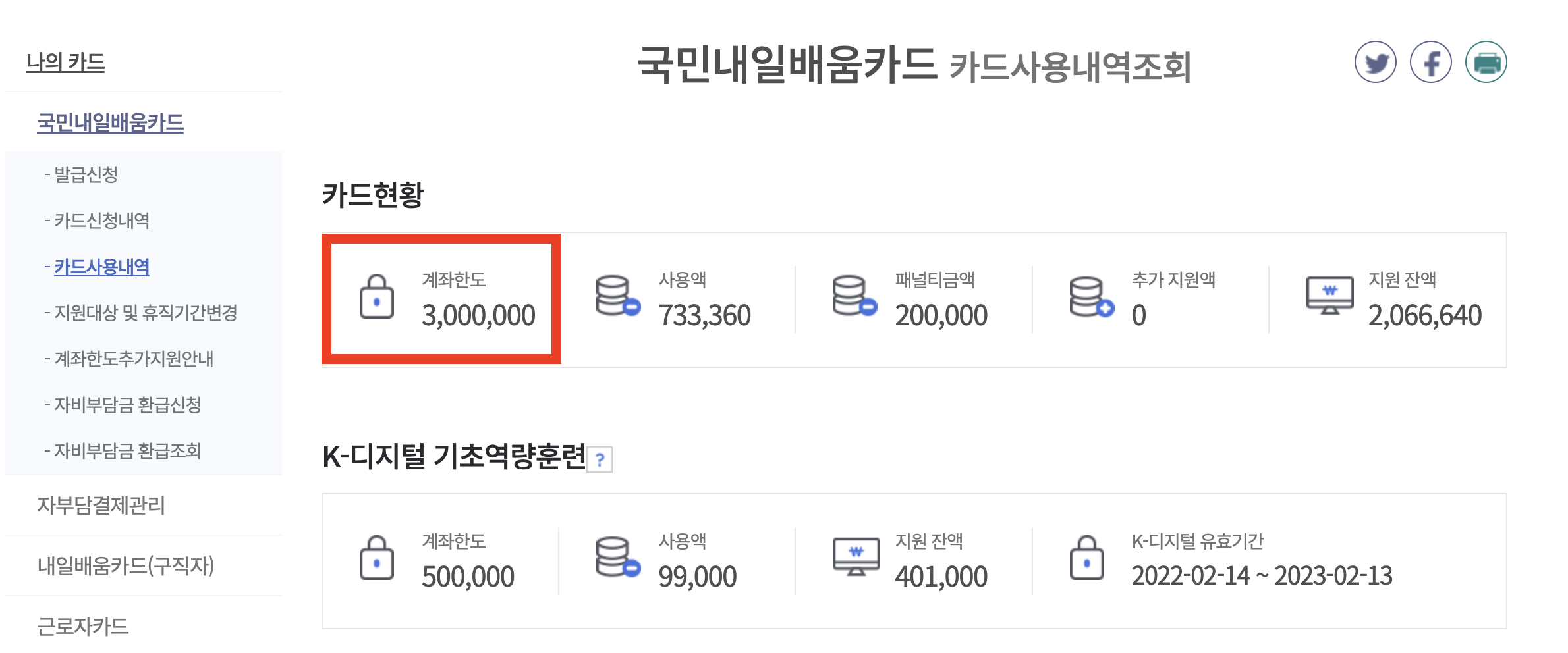 국가에서 지원하는 훈련비는 기본 300만 원 한도에서 지원되는데요. 300만 원 한도에서 모든 수업을 무료로 들을 수 있는 게 아니라 훈련비 지원율에 따라 전체 훈련비 중 일정 금액을 국가가, 나머지는 개인이 부담하게 됩니다. 그럼 지원받은 금액만큼이 계좌한도에서 차감됩니다. 다만 300만 원의 계좌를 모두 소진한 경우 일부 대상자에게는 100~200만 원의 금액을 추가지원한다고 합니다.