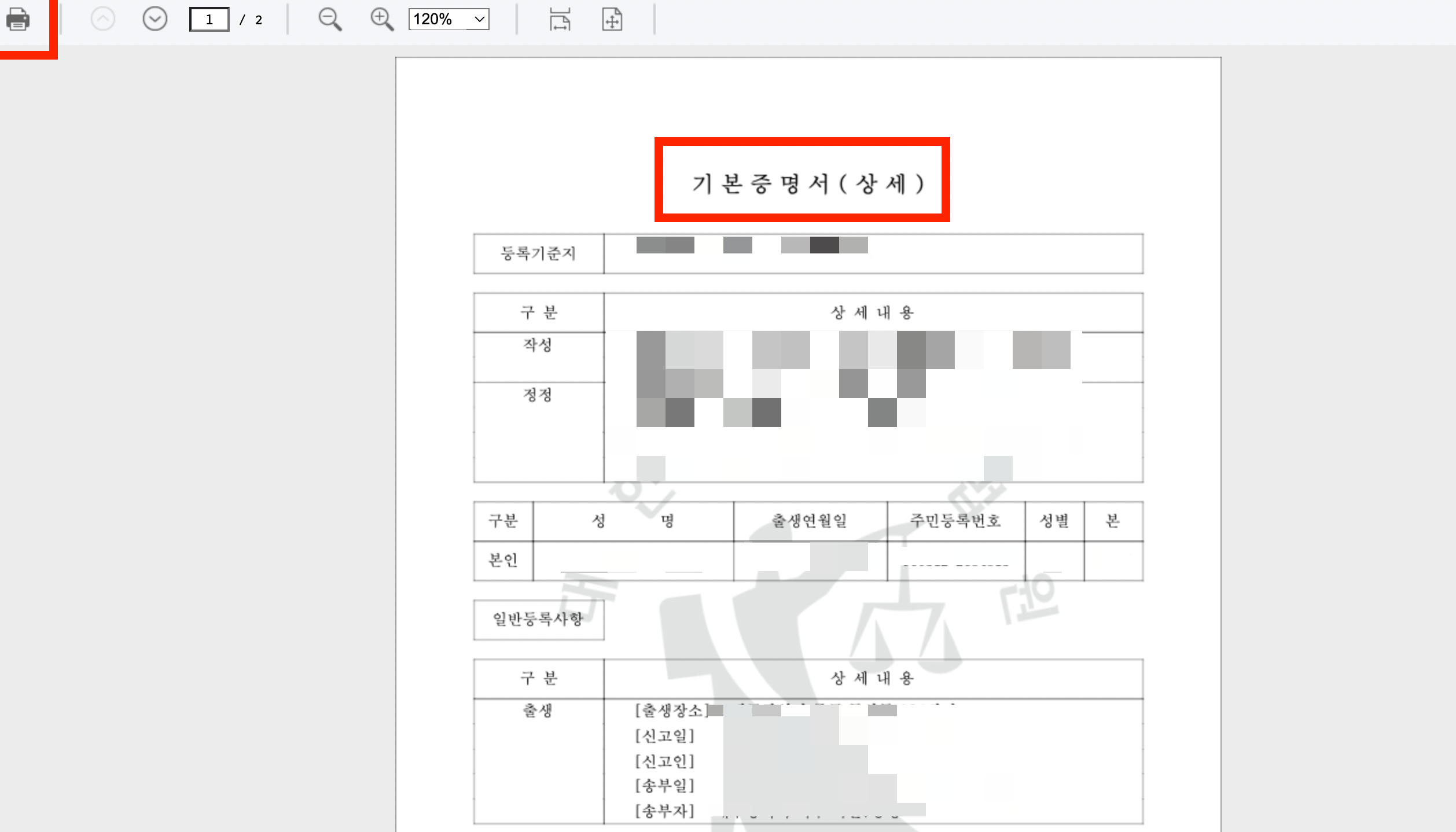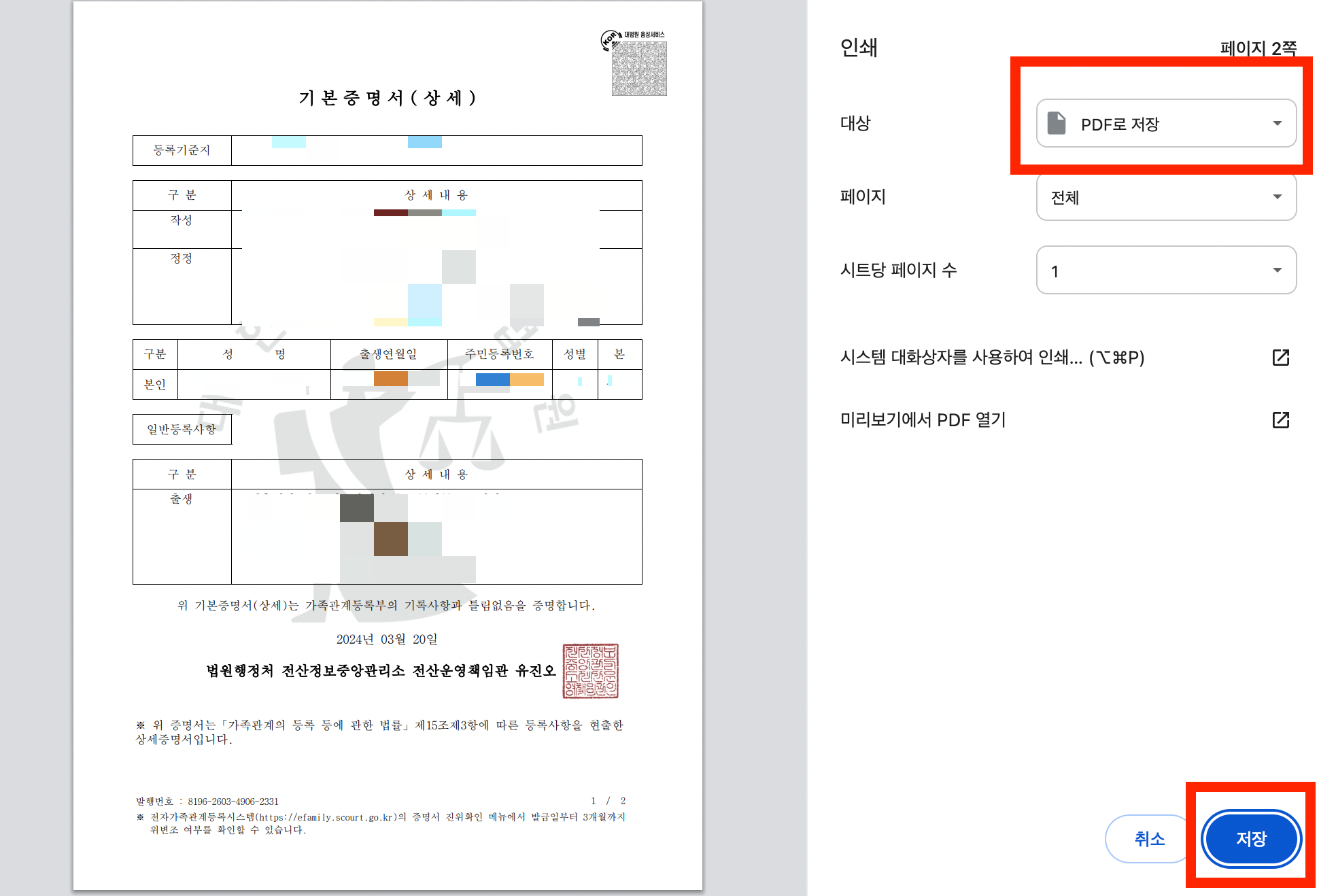당장 인쇄할 수 없는 환경이라면 우선 기본증명서를 아래와 같이 PDF 파일로 저장하셔서 추후에 따로 인쇄하시길 바랍니다.