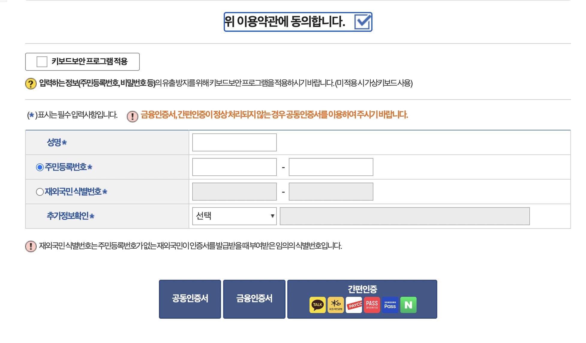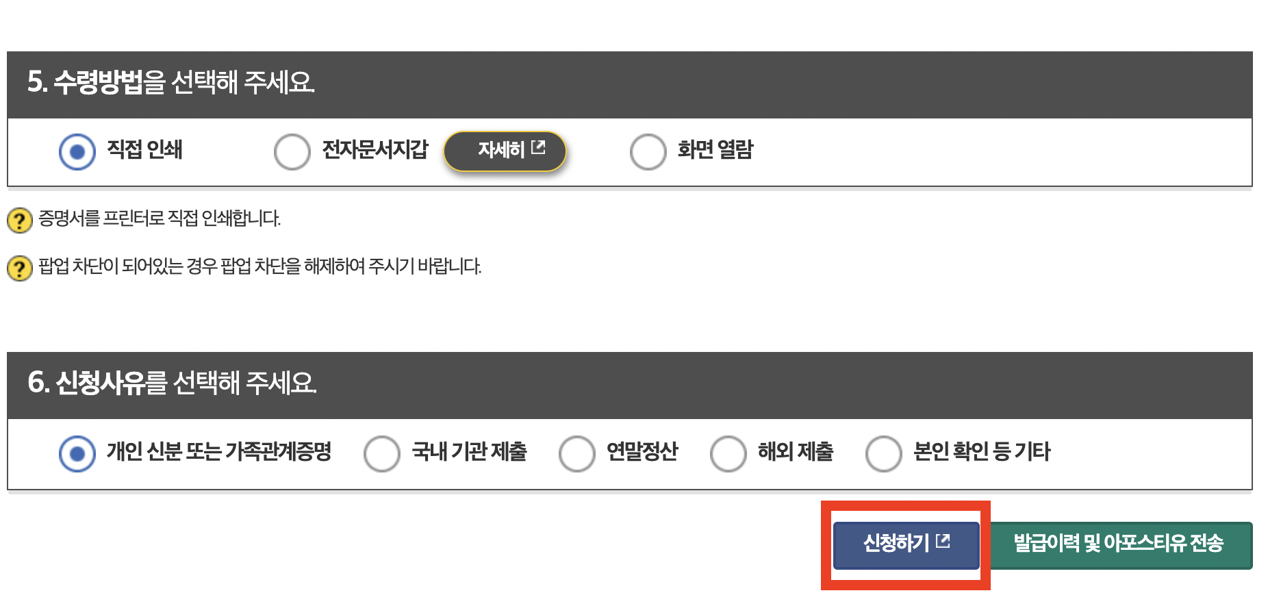 본인인증 후 아래에서 본인에게 필요한 사항으로 체크하여 발급받으시길 바랍니다.