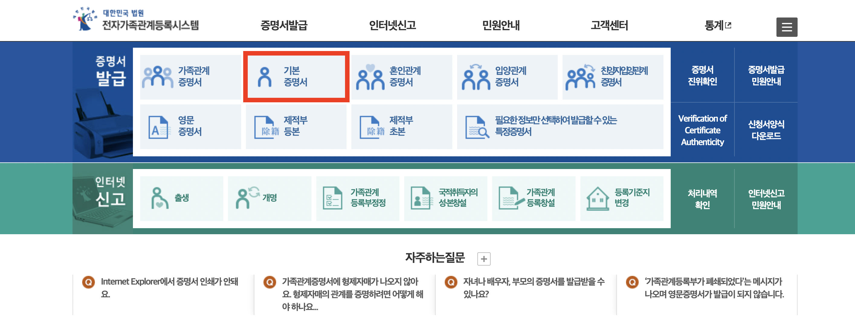 기본증명서는 정부 24가 아닌 아래 사이트에서 발급이 가능합니다.
