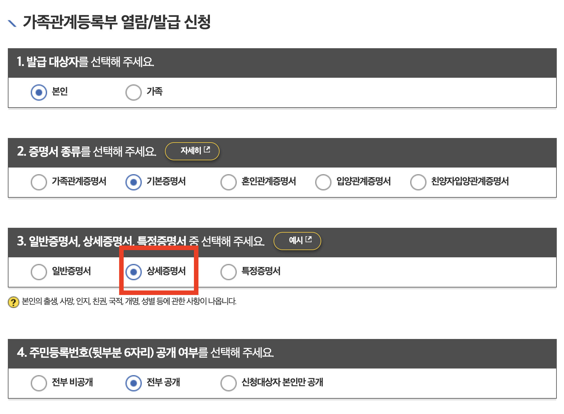 보통 기본증명서는 상세증명서로 많이 발급 받습니다.