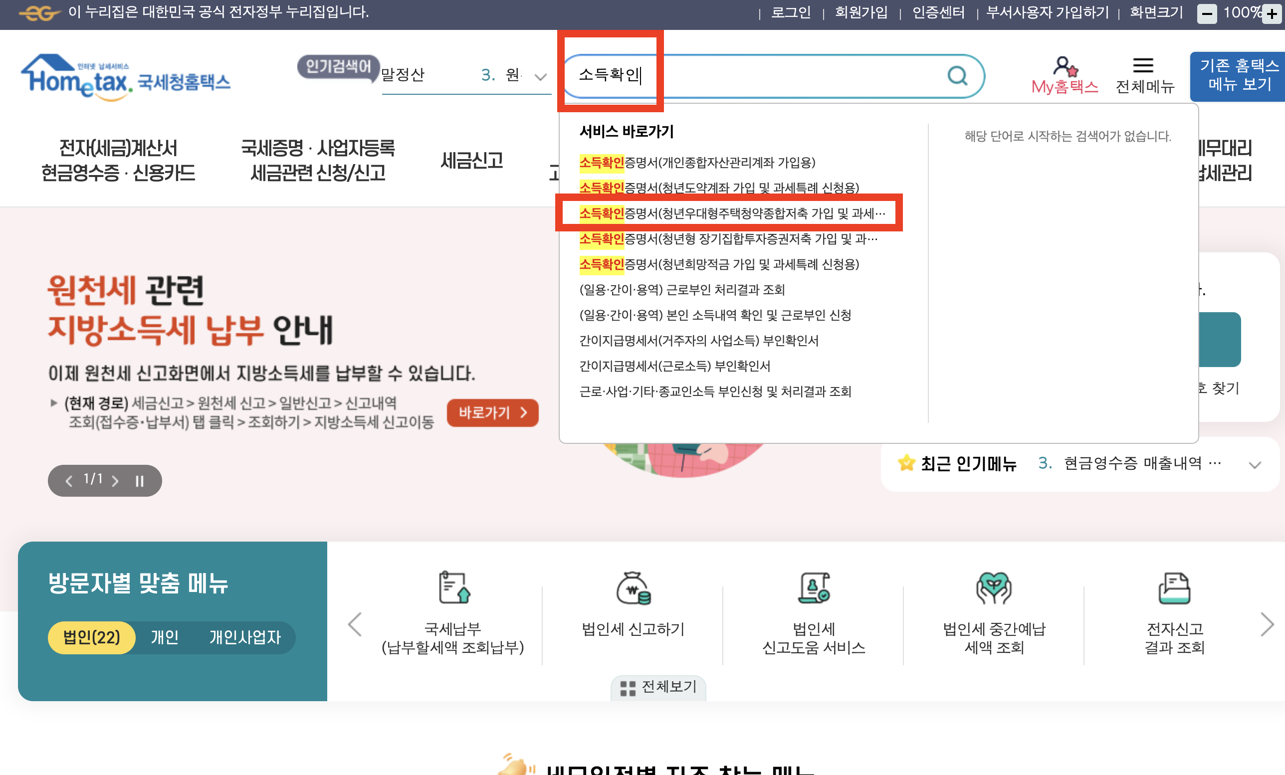 국세청홈택스 사이트에 접속합니다. 검색창에 소득확인을 입력하고 아래 소득확인증명서(청년우대형 주택청약종합저축 가입 및 과세특례 신청용)를 클릭합니다.