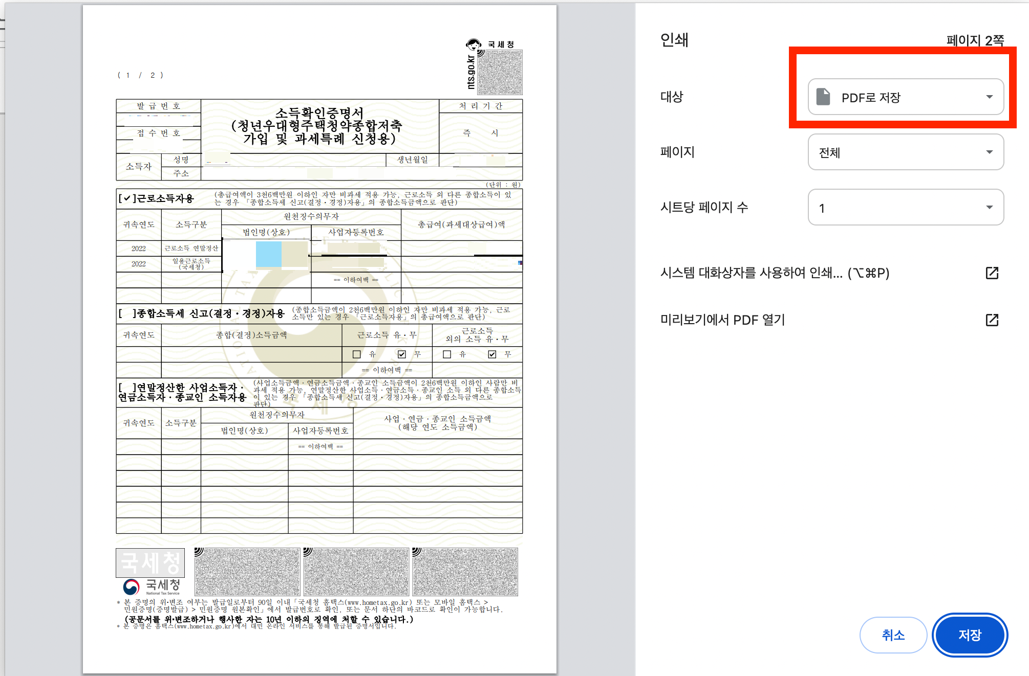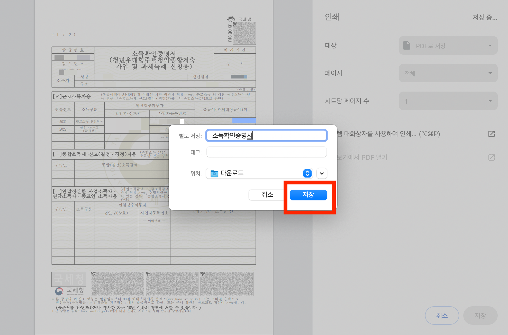 소득확인증명서 PDF 파일로 저장하기