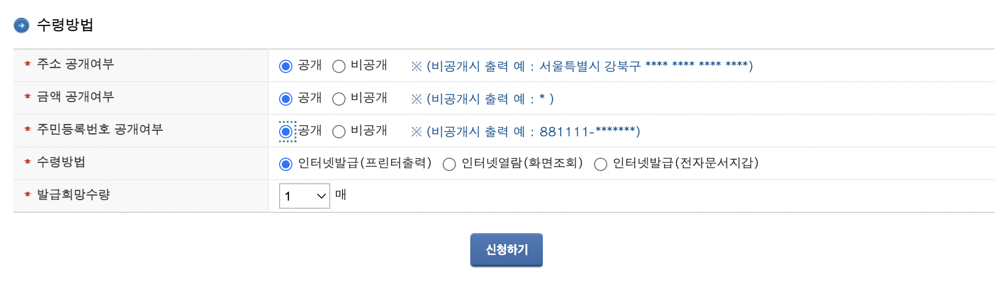 나머지 사항들은 모두 공개로 선택 후 신청하기 버튼을 클릭해 주세요.