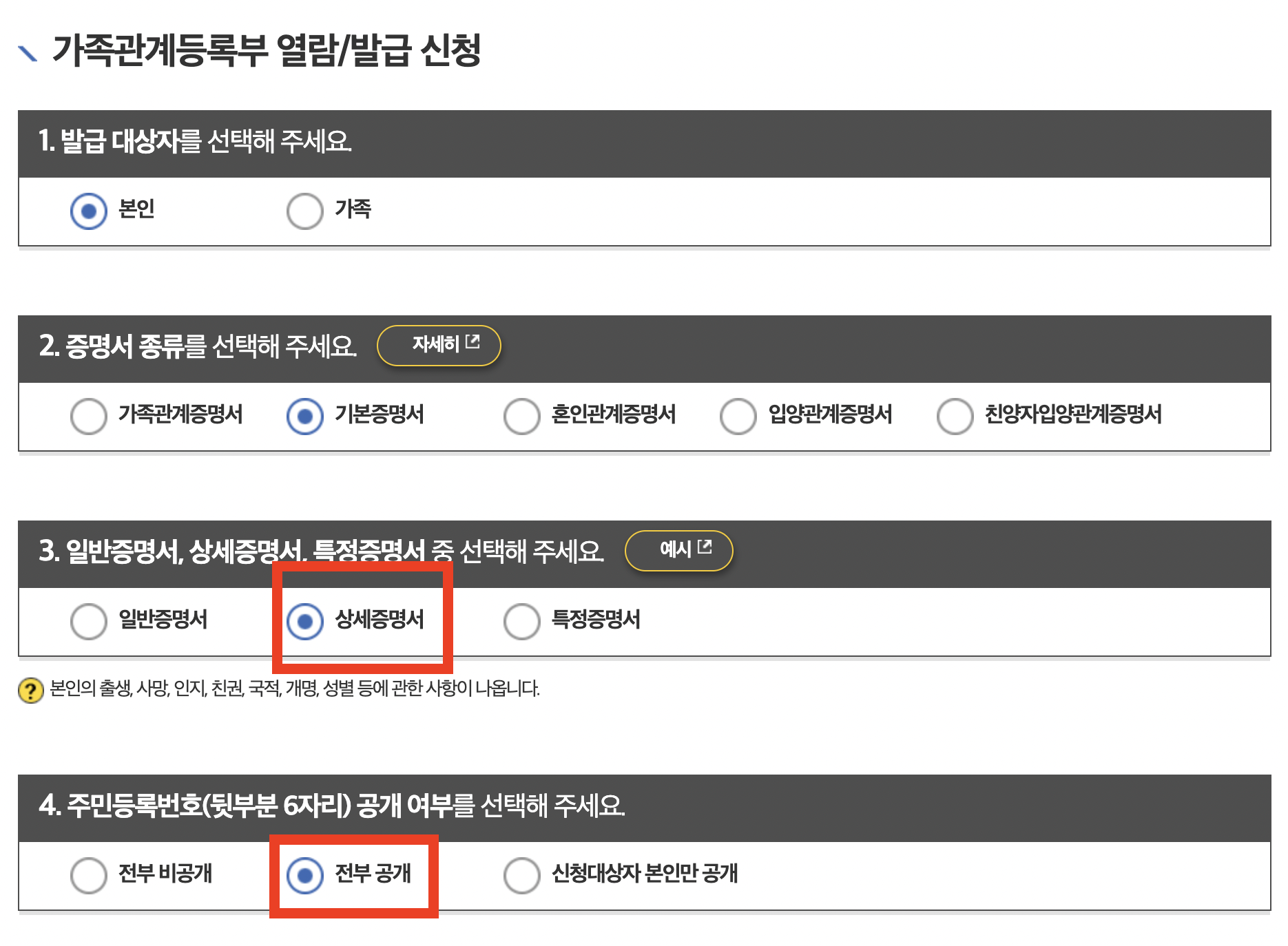 출생신고서를 발급받기 위해선 기본증명서가 필요합니다. 기본증명서를 발급받으실 때는 아래와 같이 상세증명서, 주민번호는 전부 공개로 발급받으시길 바랍니다. 기본증명서를 발급받는 방법에 대해선 아래 링크를 통한 포스팅을 참고해주시길 바랍니다.